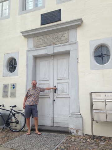 We walked into town toward the square around the Town Church (St Mary's), and I had Joy take a photo of me in front of Johannes Bugenhagen's home. He, along with Luther, were the founders of the parsonage. He also was a mission supporter for the Reformation as a movement into Scandinavia. Finally, he was Luther's confessor and pastor.